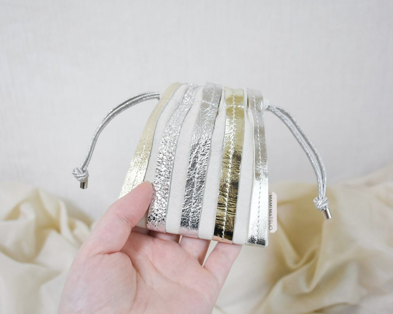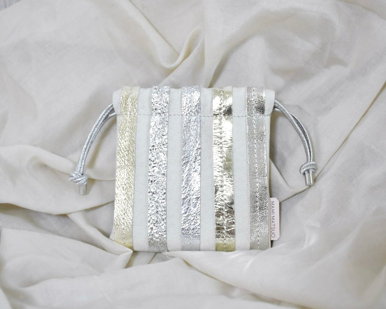 本体は軽くて柔らかい国産ピックスエードを、ストライプ部分はシルバーの箔押しをメインに、シャンパンゴールなどの革を使用しています